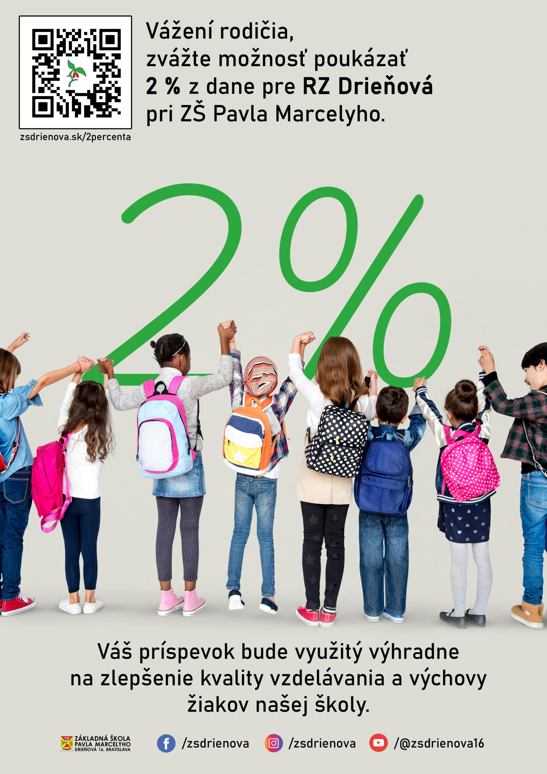 Môžete využiť možnosť škole oznámiť, že ste nám svoje 2% darovali tak, že v tlačive zaškrtnete príslušný súhlas so zaslaním Vašich údajov (nie však sumu) a my sa Vám poďakujeme aj prostredníctvom našej web/FB stránky. Veríme, že túto formu finančnej podpory využije čo najviac z Vás a tým aj Vy pomôžete skvalitniť prostredie a výučbu Vašich detí! Ďakujeme!