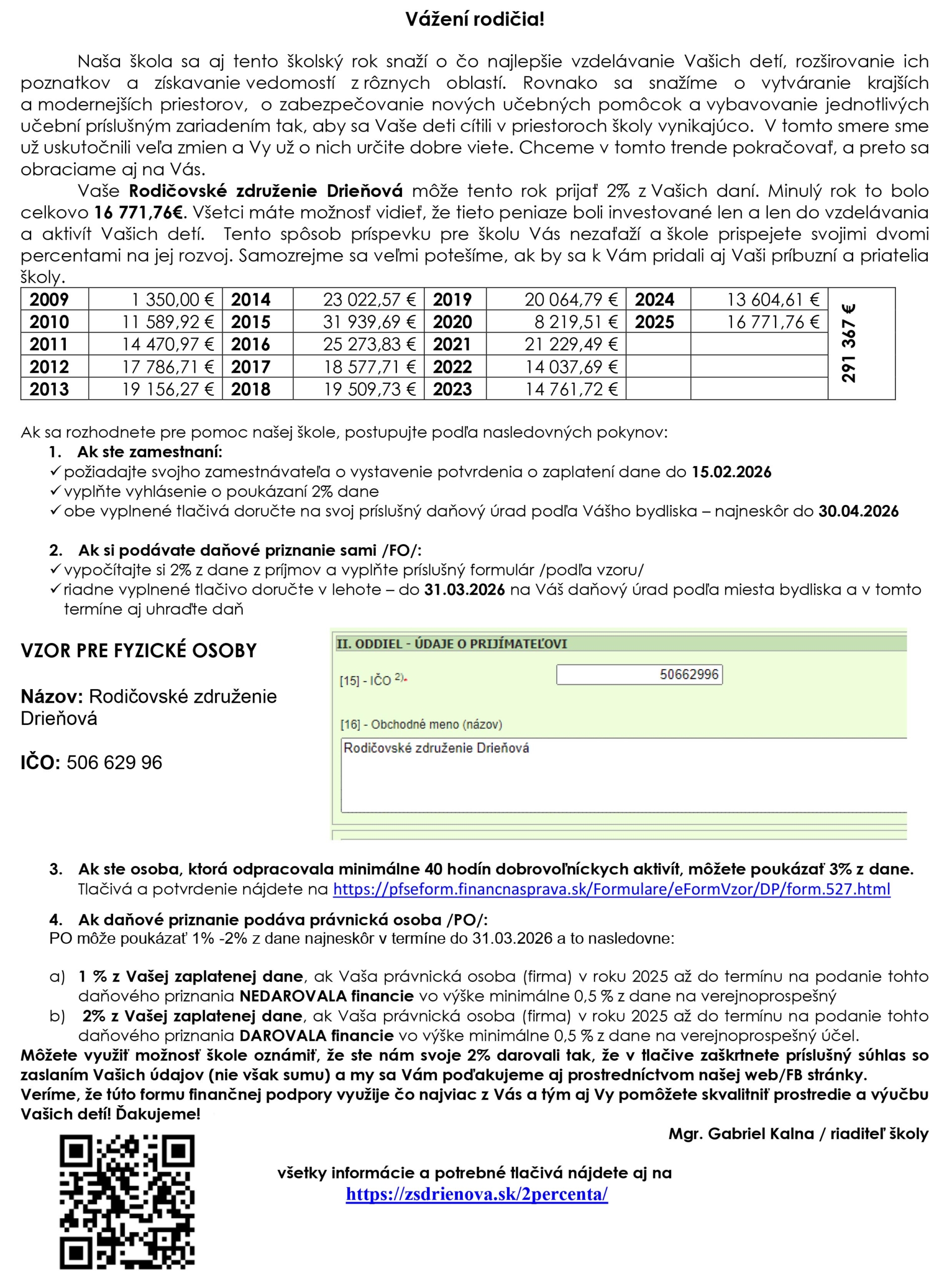 2025: 16 771,76 EUR (PREHĽAD POUŽITIA 2% ZÍSKANÝCH V ROKU 2025)